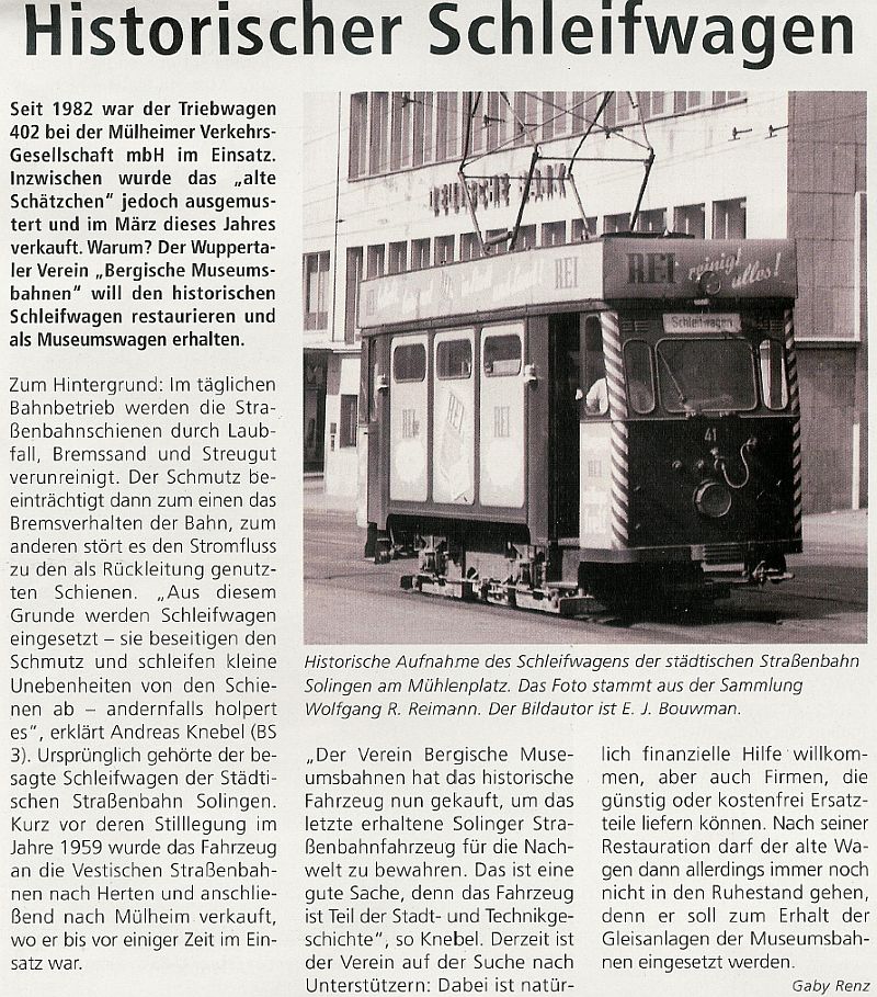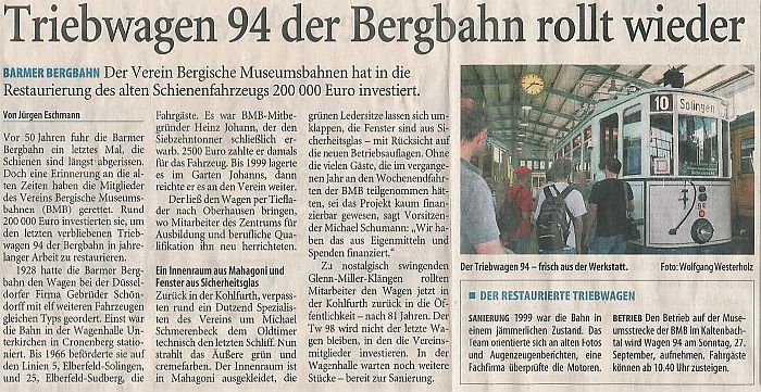 | Ein Fest mit Stars aus Stahl von Manfred Görgens Beim 17. Bergischen Straßenbahnfest gab es etliche Schmuckstücke zu bestaunen darunter auch ein Triebwagen der Bergbahn. ![]() Gute Laune und viele Oldtimer: Bei Kaiserwetter besuchten etliche Wuppertaler zu Pfingsten das Straßenbahnfest in der Kohlfurth. Die wohl weiteste Anreise hatte allerdings Tammi aus Honkong, die derzeit ihre deutsche Freundin Lisa besucht sie war Austauschschülerin in Hongkong. (Foto: Andreas Fischer) ![]() Kohlfurth. Zwar hat dat Fest mit alles seinen angestammten Sitz in der Barmer City, doch stellte sich am strahlend schönen Pfingstwochenende die Frage, ob so ein Prädikat nicht eher einem Konkurrenten in der Kohlfurth gebührt. Wahrlich, alles war da beim 17. Bergischen Straßenbahnfest: glitzernde Sonne auf den gekräuselten Wellen der nahen Wupper, Liegestühle im Strandcafé und gute Laune auch ohne tatsächliche oder nur vermeintliche Top Acts. ![]() Stars gab es indessen, nur nicht aus Fleisch und Blut, sondern aus Stahl, Messing und Holz. Einer davon stand ganz hinten im Werkstattanbau. Sein Name: Triebwagen 94. Michael Schmerenbeck hat in den vergangenen Jahren schon einiges Herzblut in diesen Wagen gesteckt, aber die Leidenschaft des gelernten Elektroinstallateurs schlummert tief unter einem dicken bergischen Fell. Entsprechend prosaisch berichtet er über die Eckdaten des Triebwagens: Der wurde ursprünglich für die Barmer Bergbahn gebaut. Unser Vereinsgründer Heinz Johann hat ihn 1966 erworben. Das Fahrzeug stand bei ihm in Hückeswagen. Großer Einsatz bei der Restaurierung: Zielmarke ist Ende dieses Jahres Mit solcher Musik im Ohr geht es regelmäßig in die Werkstatt. Ein Sonntag ist da schnell vorbei, aber auch so manches freie Stündchen in der Woche opfert Schmerenbeck der Leidenschaft für den Verein und die Straßenbahnen. Das Schwierigste sei es, Ersatzteile zu finden. Doch gerade an solchen Aufgaben wächst man schließlich. Was sich nicht im Tausch oder auf Börsen erwerben lässt, wird mit großem Aufwand nachgebaut, damit auch der Triebwagen 94 irgendwann wieder so aussieht wie in seiner Jugend. Vier Vereinsmitglieder kümmern sich in der Kohlfurth seit einigen Jahren darum, Schmerenbecks Spezialgebiet sind dabei Messingbeschläge und Holzarbeiten. Ich denke, dass wir noch im Laufe dieses Jahres fertig sein werden. 1.6.2009, Westdeutsche Zeitung |