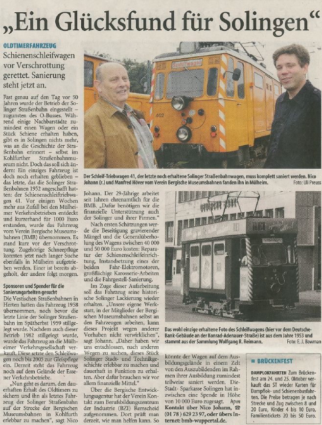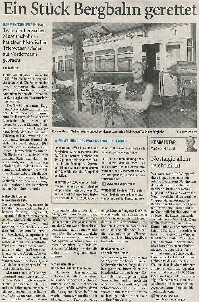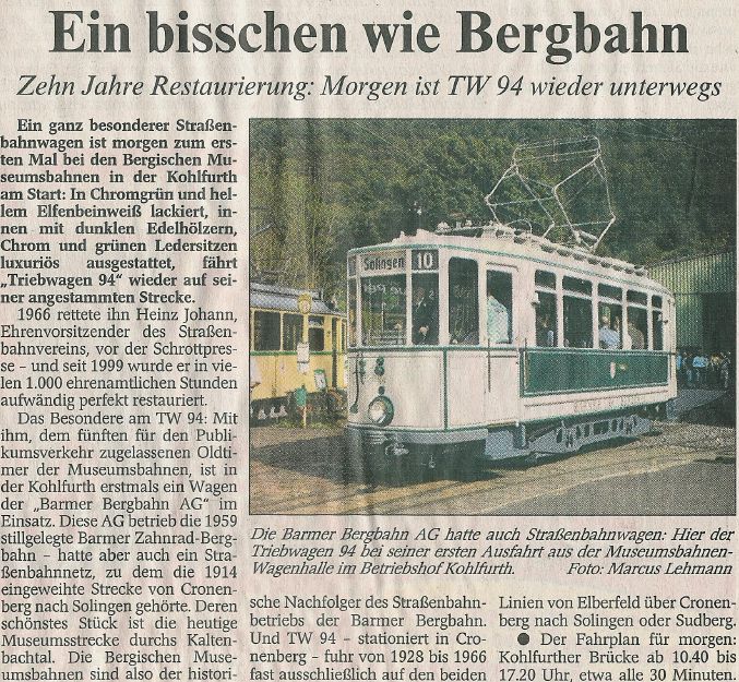 | Ein Fest mit Stars aus Stahl von Manfred Görgens Beim 17. Bergischen Straßenbahnfest gab es etliche Schmuckstücke zu bestaunen darunter auch ein Triebwagen der Bergbahn. ![]() Gute Laune und viele Oldtimer: Bei Kaiserwetter besuchten etliche Wuppertaler zu Pfingsten das Straßenbahnfest in der Kohlfurth. Die wohl weiteste Anreise hatte allerdings Tammi aus Honkong, die derzeit ihre deutsche Freundin Lisa besucht sie war Austauschschülerin in Hongkong. (Foto: Andreas Fischer) ![]() Kohlfurth. Zwar hat dat Fest mit alles seinen angestammten Sitz in der Barmer City, doch stellte sich am strahlend schönen Pfingstwochenende die Frage, ob so ein Prädikat nicht eher einem Konkurrenten in der Kohlfurth gebührt. Wahrlich, alles war da beim 17. Bergischen Straßenbahnfest: glitzernde Sonne auf den gekräuselten Wellen der nahen Wupper, Liegestühle im Strandcafé und gute Laune auch ohne tatsächliche oder nur vermeintliche Top Acts. ![]() Stars gab es indessen, nur nicht aus Fleisch und Blut, sondern aus Stahl, Messing und Holz. Einer davon stand ganz hinten im Werkstattanbau. Sein Name: Triebwagen 94. Michael Schmerenbeck hat in den vergangenen Jahren schon einiges Herzblut in diesen Wagen gesteckt, aber die Leidenschaft des gelernten Elektroinstallateurs schlummert tief unter einem dicken bergischen Fell. Entsprechend prosaisch berichtet er über die Eckdaten des Triebwagens: Der wurde ursprünglich für die Barmer Bergbahn gebaut. Unser Vereinsgründer Heinz Johann hat ihn 1966 erworben. Das Fahrzeug stand bei ihm in Hückeswagen. Großer Einsatz bei der Restaurierung: Zielmarke ist Ende dieses Jahres Mit solcher Musik im Ohr geht es regelmäßig in die Werkstatt. Ein Sonntag ist da schnell vorbei, aber auch so manches freie Stündchen in der Woche opfert Schmerenbeck der Leidenschaft für den Verein und die Straßenbahnen. Das Schwierigste sei es, Ersatzteile zu finden. Doch gerade an solchen Aufgaben wächst man schließlich. Was sich nicht im Tausch oder auf Börsen erwerben lässt, wird mit großem Aufwand nachgebaut, damit auch der Triebwagen 94 irgendwann wieder so aussieht wie in seiner Jugend. Vier Vereinsmitglieder kümmern sich in der Kohlfurth seit einigen Jahren darum, Schmerenbecks Spezialgebiet sind dabei Messingbeschläge und Holzarbeiten. Ich denke, dass wir noch im Laufe dieses Jahres fertig sein werden. 1.6.2009, Westdeutsche Zeitung |