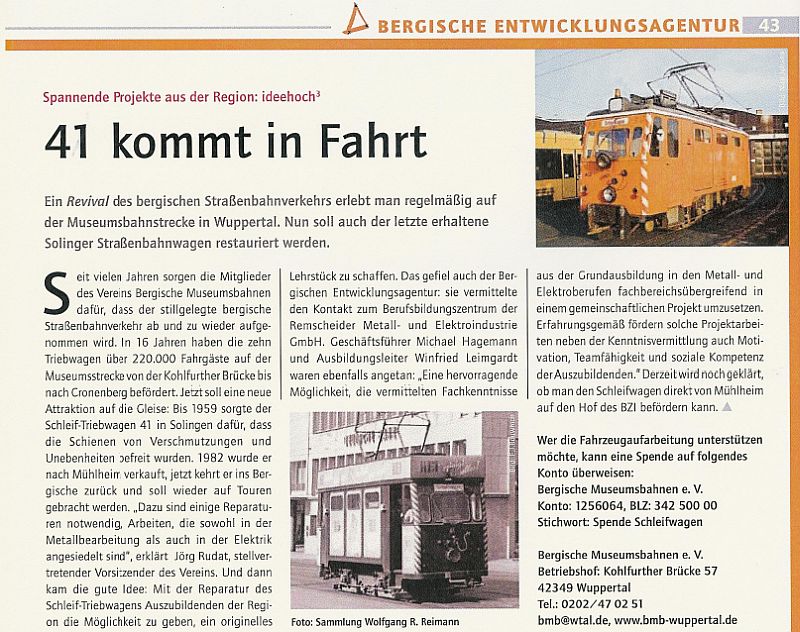Weg vom Bimmelbahn-Image von Stefan Melneczuk In der Kohlfurth wurde am Sonntag an das Ende der Straßenbahnlinie 5 erinnert. Der Verein hat viele Pläne für die Zukunft. ![]() Kohlfurth. Beim Verein der Bergischen Museumsbahnen in der Kohlfurth sind Vergangenheit und Zukunft nur wenige Meter voneinander entfernt: Auf der einen Seite wurde dort mit einer Sonderfahrt gestern an das Ende der Straßenbahnlinie 5 zwischen Wuppertal und Solingen vor 40 Jahren erinnert. ![]() Auf der Museumsstrecke zwischen der Kohlfurth und Möschenborn hier am Haltepunkt Greuel erinnerte gestern ein geschmückter Straßenbahnwagen an die letzte Fahrt der Linie 5 vor 40 Jahren. Auf der anderen Seite hat der Verein ambitionierte Pläne für die Zukunft. Neben der letzten 600-Meter-Etappe zwischen den Haltepunkten Greuel und Möschenborn steht eine weitere Wagenhalle mit Nahverkehrsmuseum ganz oben auf der Liste. Ob er der Straßenbahn in Wuppertal nachtrauert? Thomas Wächter er trägt beim Pressetermin in der Museumsbahn eine alte Schaffner-Montur muss als Vereinsmitglied bei dieser Frage nicht lange überlegen: Natürlich, sagt der 54-Jährige. Letztendlich sind Straßenbahnen umweltfreundlicher als Busse. ![]() Bevor im Jahr 1987 die letzte Stunde der Wuppertaler Straßenbahnen schlug, war es am 3. Mai 1969 für die Linie 5 soweit: Zwischen Dönberg und Solingen brachte sie es auf fast 20 Streckenkilometer und eine Fahrtzeit von 71 Minuten. Der Stilllegung folgte ebenfalls 1969 die Gründung der Bergischen Museumsbahnen (BMB) als Verein. Auf dem späteren Museumsgelände in der Kohlfurth wurden vier Jahre später die ersten Fahrzeuge angeliefert. Der Fahrbetrieb startete am 24. Mai 1992. Neben angekündigten Sonder-Aktionen zum 40-jährigen Vereinsbestehen (siehe Info-Kasten rechts) gibt es beim Ortstermin in der Kohlfurth auch deutliche Worte: Der Verein wolle bei allen Erfolgen der vergangenen Jahrzehnte weg vom Bimmelbahn-Image, das man nach wie vor gerne mit der Kohlfurth verbinde, erklärt der Vorsitzende Michael Schumann. Gut 30000 Gäste im Jahr und ein Museum für die Barmer Bergbahn Abgesehen davon, dass man mit jährlich gut 30000 Gästen nach dem Von der Heydt-Museum in Elberfeld das am zweithäufigsten besuchte Museum im Stadtgebiet biete, habe man sich nach dem Lückenschluss zum Möschenborn ein klares Ziel für die Zukunft gesetzt: Um mehr Platz für die Museumsbahnen zu bieten, soll in Nachbarschaft zur bestehenden Wagenhalle eine weitere errichtet werden. Auf zwischen 700000 und 800000 Euro werden die Kosten für eine Kombination aus Straßenbahn-Depot und Bergischem Nahverkehrsmuseum geschätzt Geld, das vor allen Dingen durch Spenden und Sponsoren sowie durch Zuschüsse zusammenkommen soll. Teil des Neubaus wäre ein modernes Ausstellungs-, Dokumentations- und Besucherzentrum, das auch die Barmer Bergbahn angemessen würdigt: Die bestehenden Halle beherbergt einen ihrer Wagen, der bereits seit sechs Jahren mit großem Aufwand auf Vordermann gebracht wird und auf der Museumsstrecke zum Einsatz kommen soll. Wie berichtet, wurde die Bergbahn vor 50Jahren stillgelegt und bietet aus Sicht der BMB ein ideales Beispiel, Verkehrsgeschichte darzustellen. Und das weit über die Stadtgrenzen hinweg: Selbst aus den Niederlanden und Großbritannien wurden bereits Gäste in der Kohlfurth begrüßt aus der näheren Umgebung kommen vor allen Dingen Familien und ältere Wuppertaler, die noch einmal das Straßenbahn-Gefühl erleben wollen. 3.5.2009, Westdeutsche Zeitung |